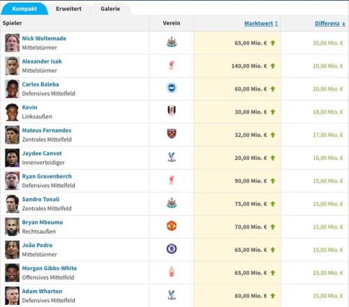 雷速体育10月17日宣 此前,德国转会市场进行了新一期英超球员身价的更新。纽卡前锋沃尔特马德的身价上涨至6500万欧,上涨了3500万欧,是身价上涨幅度最大的球员,利物浦前锋伊萨克和布莱顿中场巴莱巴均上涨了2000万欧。
