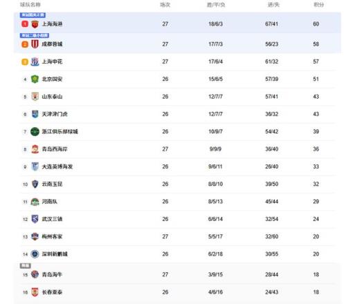 随着申花21,蓉城31,海港43,中超积分:3队争冠,4队保级