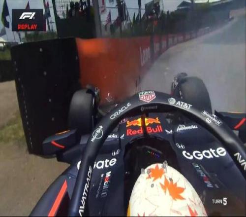 角田失控碰到5号弯护墙,前翼受损,他驾驶赛车返回维修区
