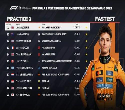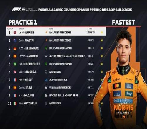 北京时间11月7日,F1巴西大奖赛唯一一次练习赛结束。诺里斯在最后时刻超越皮亚斯特里拿到P1,皮亚斯特里、霍肯伯格位居二三,阿隆索第四,博托莱托第五,拉塞尔第六,维斯塔潘、勒克莱尔、汉密尔顿分列17-19位。
