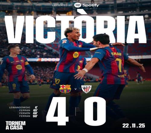 北京时间11月22日23:15,西甲联赛第13轮,巴塞罗那重回诺坎普球场迎战毕尔巴鄂竞技。上半场莱万破门,费兰补时打进单刀球,巴萨暂2-0毕尔巴鄂竞技;下半场费尔明破门,桑塞特直红,比赛最后时刻亚马尔助攻费兰单刀再下一城,最终巴萨4-0十人毕尔巴鄂竞技,回到诺坎普首战开门红,先赛积分追平皇马。