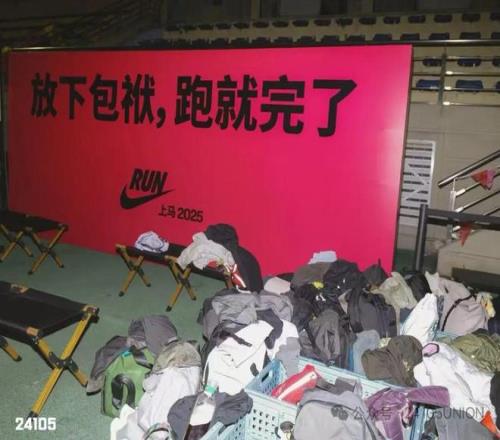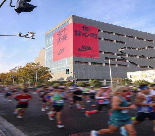 在媒体和跑者都在讨论这次上马NIKE的赛道“PUA文案”时,不知道还有没有人记得两周前北马赛道旁那块被胶布贴住LOGO的广告牌。