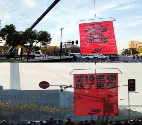 不过比起文案,我更佩服的是NIKE对于广告资源“我要就一定拿到”的执行力。观察了一下这次的大字报出现的广告位,很多都是非标的(甚至还有挂吊车臂上的)。