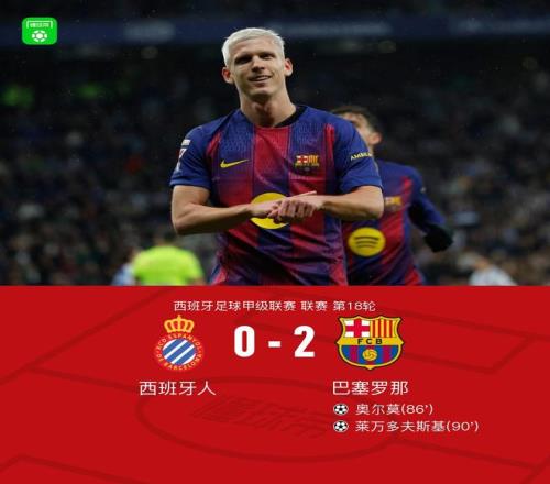 北京时间1月4日西班牙足球甲级联赛 联赛 第18轮,西班牙人主场对阵巴塞罗那。上半场,两队均无建树。下半场,费尔明助攻双响,奥尔莫和莱万相继破门。整场比赛,巴萨门将霍安-加西亚奉献多次精彩扑救。全场比赛结束,巴萨2-0击败西班牙人,迎来各项赛事8连胜,继续稳居西甲榜首。